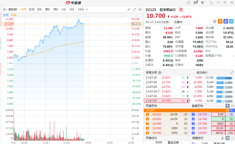 1月15日消息,稻草熊娱乐今日在港挂牌,股价逆市拉升涨近81.97%,现报10.7港元,市值达70港元。昨日暗盘开报7港元,最终收报7.71港元,较招股价涨31.12%,每手赚1830港元。