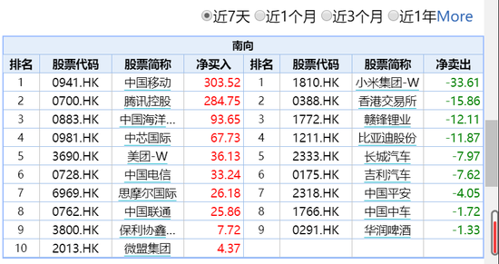 其中,内资买入中国移动超300亿,腾讯285亿,小米遭卖出33亿。