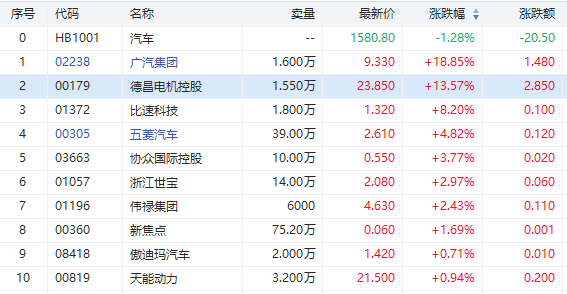 其他成分股,德昌电机控股涨超13%,比速科技涨超8%,五菱汽车涨超4%。