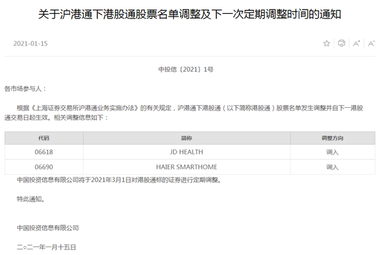 1月15日消息,上交所:将京东健康、海尔智家调入沪港通下港股通股票名单。