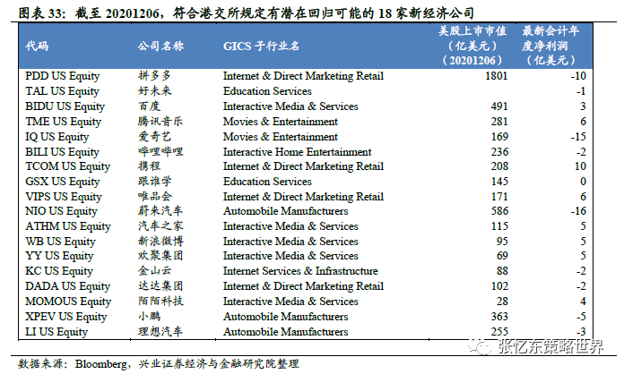 2019年年底阿里巴巴上市以来,有10家中概股陆续赴港二次上市。截至12月6日,仍有46家公司符合港交所规定有潜在回归可能,对这46家公司我们进行了重新梳理,其中有18家新经济公司。除了已经在港上市的阿里巴巴、京东、网易,还有诸多新经济明星公司如拼多多、蔚来汽车、百度、腾讯音乐、爱奇艺、哔哩哔哩、好未来等。