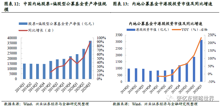 第四,内地公募基金大发展对港股具有明显溢出效应。2020年是中国公募基金蓬勃发展的阶段,截至2020年Q3,中国内地公募股票型和偏股混合型基金资产净值达到3.7万亿元,较去年同期增长90%。规模巨大的公募基金投资高性价比的港股,截至2020年Q3公募基金中港股投资市值约为3141亿元人民币,较去年同期增长234.3%。
