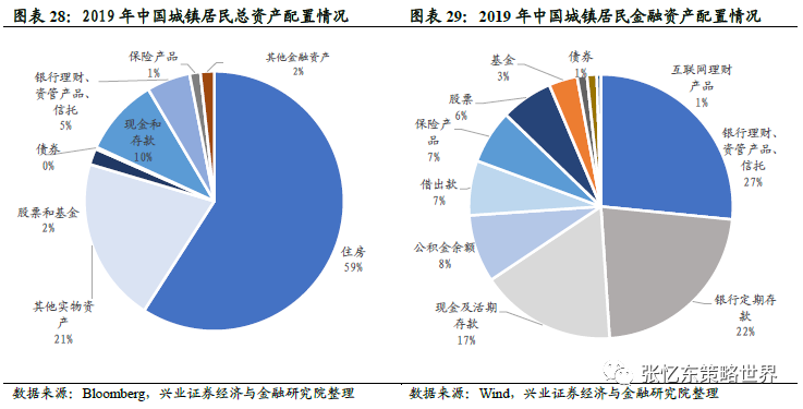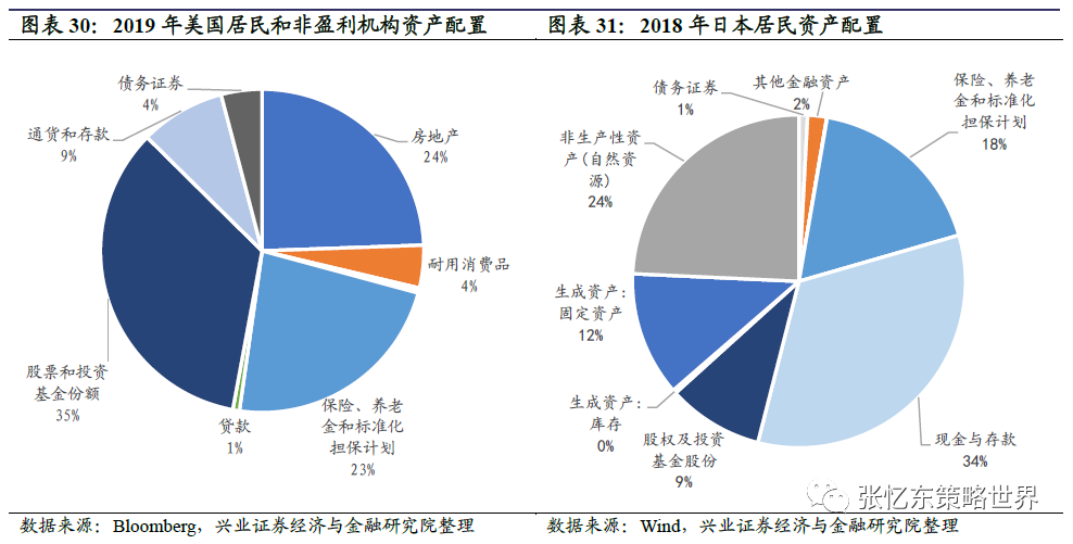 中国居民资产配置之中,权益资产配置的比例明显偏低。根据中国人民银行发布的城镇居民资产负债调查:2019年,城镇居民总资产中59%配置于房地产,仅2%配置于股票和基金;在金融资产中,现金和存款47%,股票6.4%、基金3%。而海外比较来看,2019年美国居民总资产的24%为房地产,股票和基金占35%,保险和养老金占23%。同样,高储蓄率的日本,2018年股票和基金占9%。