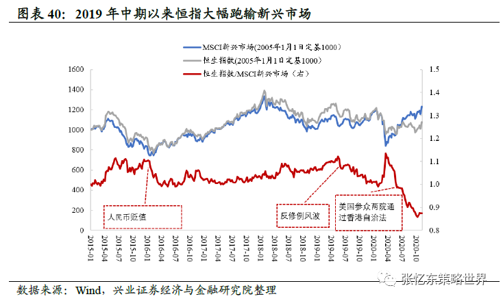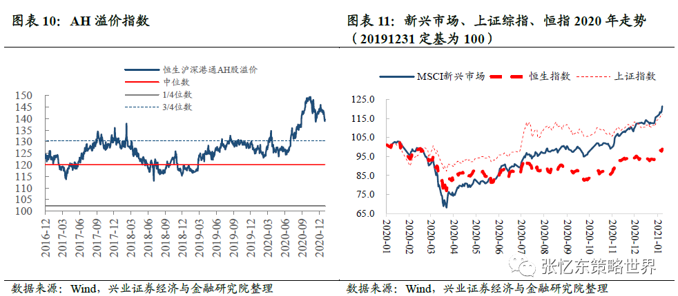 第三,港股的性价比好于A股,吸引内地资金增加对港股的配置。2020年受地缘政治与海外疫情的影响,港股的风险偏好受到压制,港股不只跑输A股甚至跑输了整个新兴市场,AH股的估值溢价最高的时候接近50%,。同一家内地公司分别在A股和港股上市但在A股估值合理的情况下,港股却便宜了50%,说明港股明显是被错杀了,毕竟AH股两地上市的内地公司的基本面与香港本地的疫情和地缘政治无关。