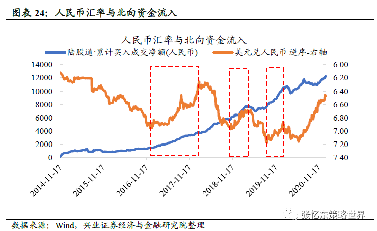 历史上,人民币汇率升值加速北向资金流入。2017年,2018年11月-2019年3月以及2019年9月-2020年1月,人民币快速升值期间,北向资金往往加速流入。