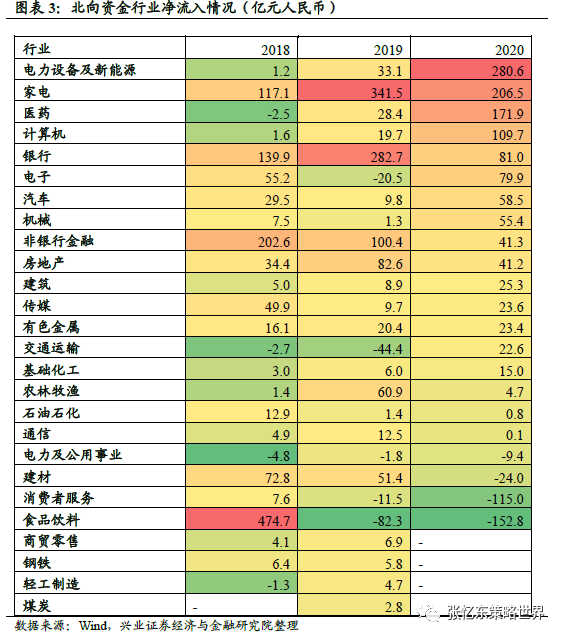 1.北向资金净流入前三大行业:2018年为食品饮料、非银金融和银行,2019年为家电、银行和非银金融,而2020年北向资金净流入前三大行业为电力设备及新能源、家电和医药行业,金融业排名掉出前三,食品饮料大幅流出。