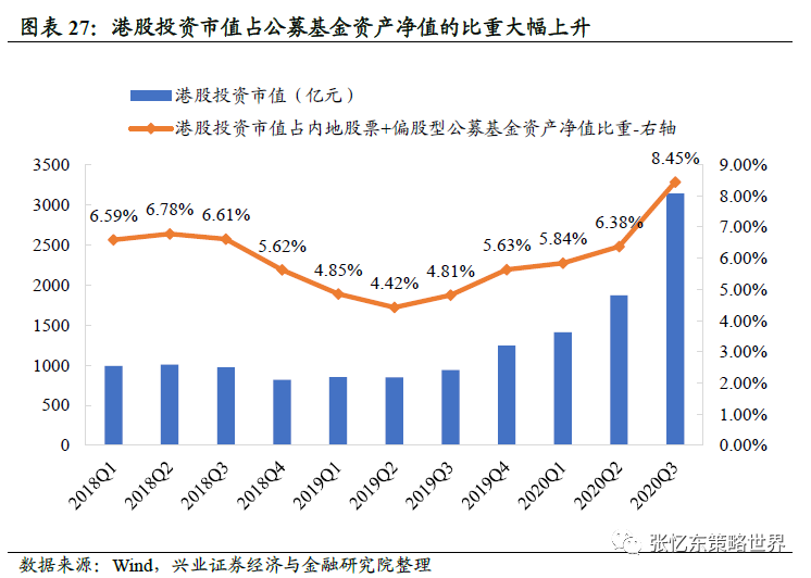 其次,随着互联互通机制的深化,港股正逐步摆脱离岸市场的定位,港股已经成为中国权益资产投资的重要组成部分。通过港股通进行投资的内地资金有望成为港股市场的中流砥柱和“本土”资金。2020年Q3中国内地公募基金中港股投资市值达到3140.6亿元,占内地股票+偏股型公募基金资产净值比重大幅提高至8.45%,较2019年底的5.63%提升2.81个百分点。未来无论是港股投资市值规模还是占公募基金资产净值的比重均有望进一步提升。