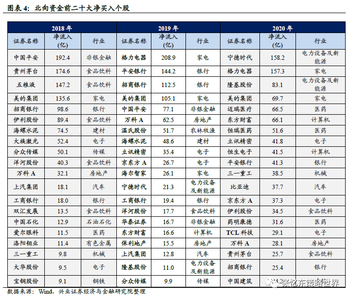 2)净流入的行业变化:前三行业易主。2018食品饮料、非银金融和银行,2019家电、银行和非银金融,2020电力设备及新能源、家电和医药行业。
