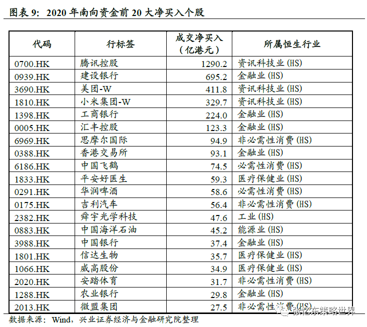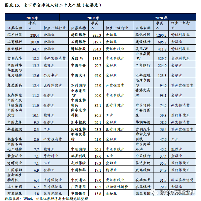 个股角度,在港股拥抱新经济的大背景下,南下资金前二十大个股业由金融业主导,向金融、消费和资讯科技业转向。2018年南下资金流入最多的是汇丰控股、工商银行和农业银行此类的金融公司,而2020年流入最多的是腾讯控股、美团和小米等新经济公司。