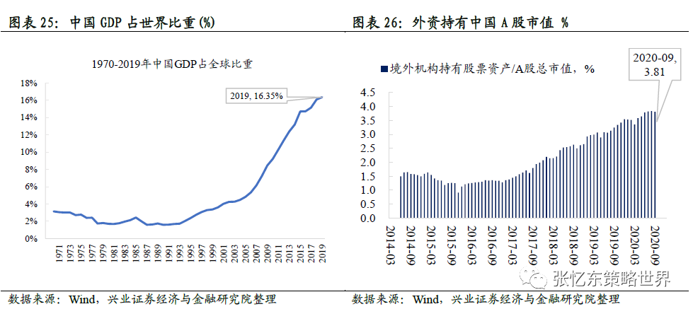 海外资金配置中国资产方兴未艾。2019年中国GDP规模占全球约16.4%,但是,海外资金配置中国权益资产仅约3%,外资在中国A股市场持有市值占比也仅在3.8%左右。另外,参考日本、韩国、中国台湾地区资本市场对外开放的进程,外资持有市值占比都是在20-30%左右。