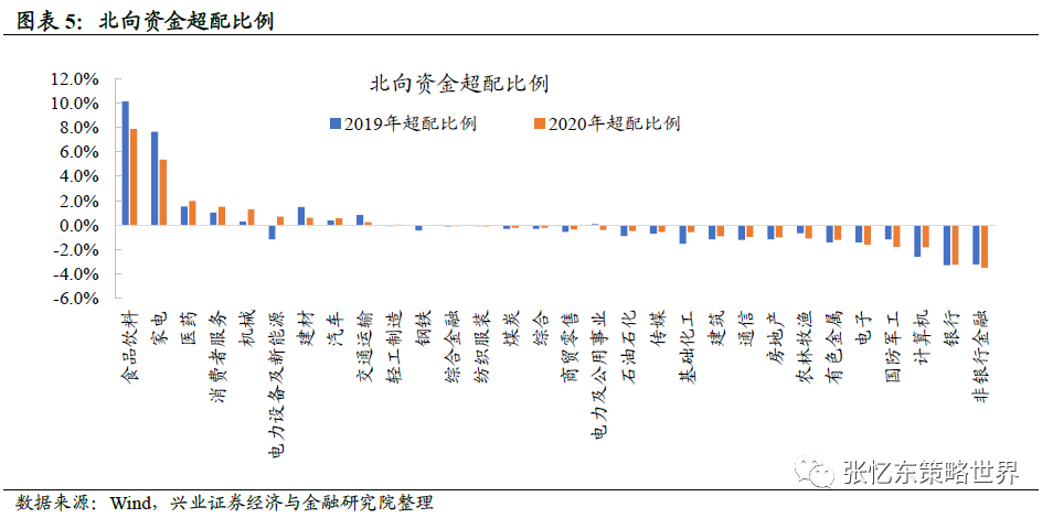 4)从持股比例来看,食品饮料(7.9%)、家电(5.4%)和医药(2.0%)仍为超配比例最高的三大行业,但食品饮料和家电超配比例相较于2019年均下降2.3%;超配比例上升最大的是电力设备及新能源,提高1.9个百分点至0.7%。