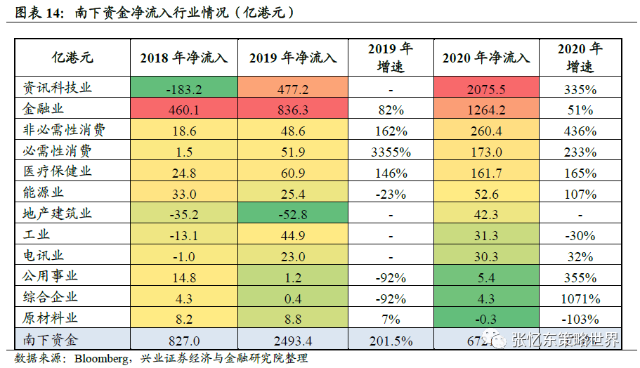 2、2020年南向资金净流入创历史新高,加速流入资讯科技和消费。