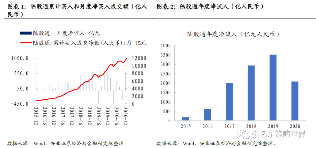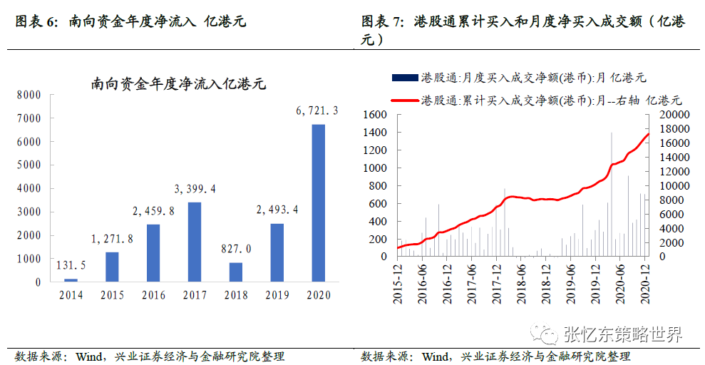 2020年内资通过港股通流入港股约6721.3亿港元,较此前大幅增加,2021年我们判断南向资金规模有望保持“汹涌”之势。