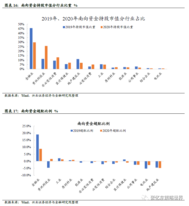 3)南下资金超配比例:相对港股通标的行业分布,南下资金超配比例最高的仍为金融(8.8%),但超配比例较2019年下降10.2个百分点,其次是资讯科技业(1.6%),超配比例较2019年上升5.2个百分点。
