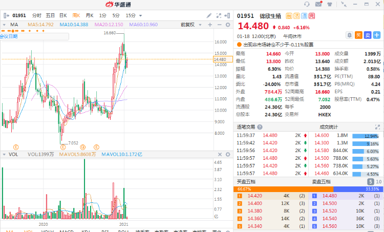 另外,在于2021年1月4日的一则市场消息。消息称,锦欣生殖(01951-HK)有股东拟按每股14.9至15.2元,配售8000万股,配售价格较前天收市价16.12元有5.71%至7.57%折让。配售股份禁售期为90日。消息一经发出,锦欣生殖股价第二天即下跌5.71%。