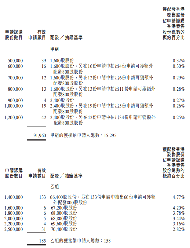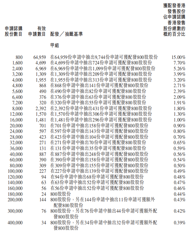 公开发售一手中签率15%,申购225手稳获一手,乙头获配83-84手。