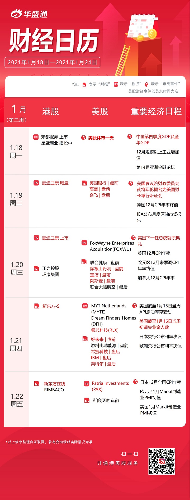 财经事件方面,十三届全国人大常委会第二十五次会议1月20日至22日在北京举行。其他会议方面,由香港特区政府主办的第十四届亚洲金融论坛于1月18日至19日在线举行。此外,欧元区将举行财长会议,日本央行和加拿大央行将公布利率决议。