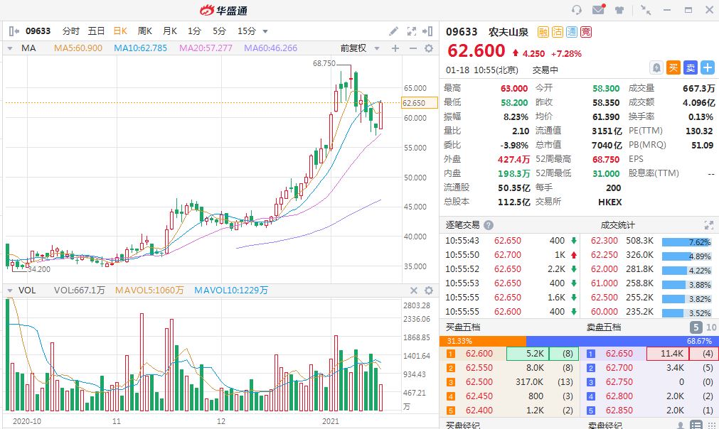 华盛证券1月18日消息,农夫山泉(09633)今日低开高走,股价一路上涨超7%。截至发稿,农夫山泉涨7.28%,现报62.6港元每股,当前成交额达3.783亿港元,总市值为7040亿港元。