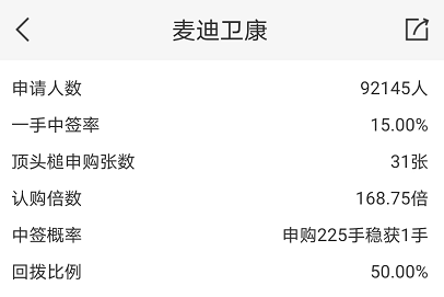 总认购人数92145人,64959人只认购1手(一手党),中签率15%,申请225手稳获1手。