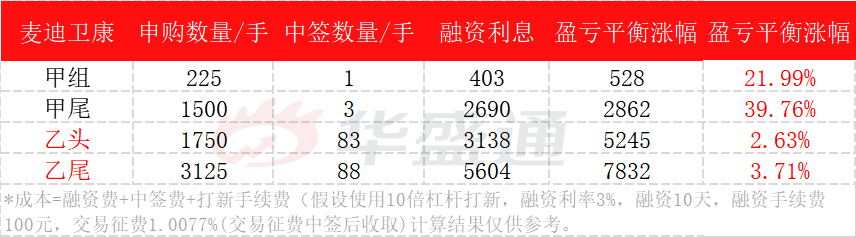 乙头融资打新1750手,以中签83手为例,盈亏平衡点2.63%;