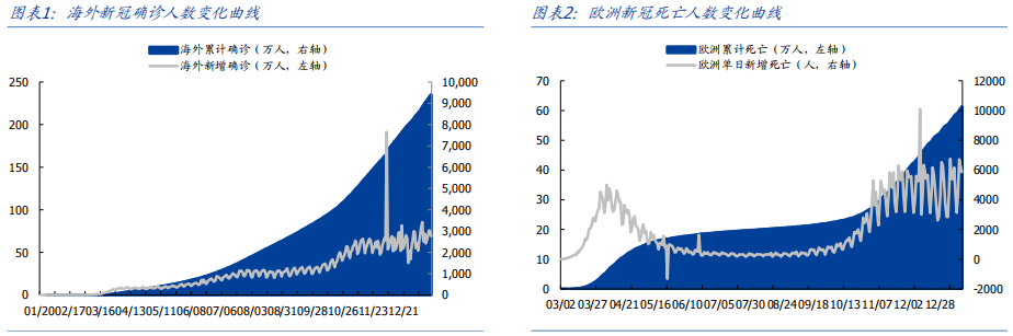 截至2021年1月15日,海外新冠新增确诊69.1万人,现有确诊2452.0万人,累计确诊9418.6人,累计死亡201.2万人,累计治愈6765.4万人。当前海外新增确诊持续高位(60至80万人/日),美国单日新增超过25万人;其他重点地区如巴西、英国单日新增超过5万人,印度、俄罗斯、法国等单日新增超过万人,海外疫情反复;欧洲单日新增死亡人数保持6000人/日的高位水平,其中英国疫情持续严重,单日新增突破5.5万人。