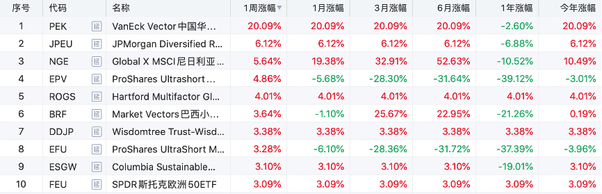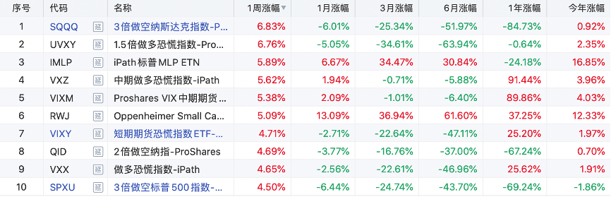 收益最高的是3倍做空纳斯达克指数的SQQQ,一周累计涨幅6.83%。2倍做空纳指跌QID及3倍做空标普500的SPXU取得的收益也排进前10。
