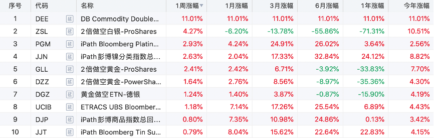 上周,商品ETF表现中较好的是做空白银、镍及黄金的ETF。其中,2倍做空白银的ZSL一周累涨超4%,今年累计涨幅超过10%。此外,2倍做空黄金的GLL及DZZ有少许涨幅。