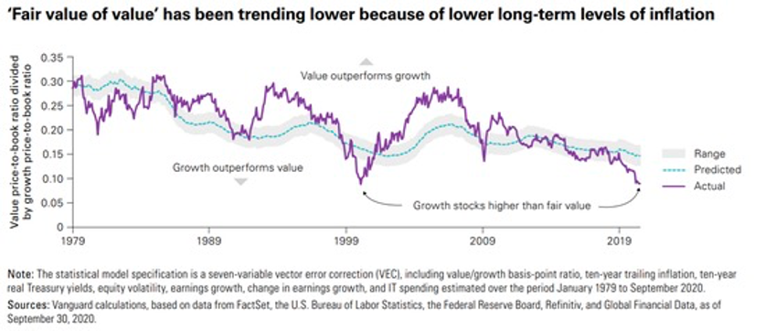 拥有6.2万亿美元资产的指数基金巨头先锋集团在2021年展望中表示:“价值股低迷的时代即将终结,”不过他们也补充道:“我们只是不确定具体是何时。”他们表示:“我们的研究表明,价值溢价确实存在,成长股最近表现优异,部分原因可能是通胀水平呈下行趋势,以及过去10年盈利增长趋于停滞。”