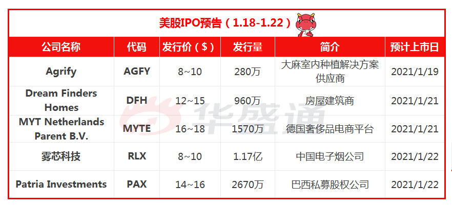 美股IPO市场持续火爆,本周预计将有5家传统IPO发行,企业覆盖多个国家与行业。包括美国的大麻室内种植解决方案供应商Agrify、房屋建筑商Dream Finders Homes;德国的奢侈品电商MYT Netherlands Parent B.V.;中国电子烟公司雾芯科技,还有巴西的私募股权公司Patria Investments Limited。