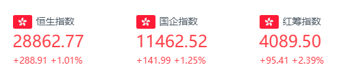 周一,恒生指数涨288.91点或1.01%,报28862.77点,全日成交额达2243.97亿。国企指数涨1.25%,报11462.52点,红筹指数涨2.39%,报4089.5点。