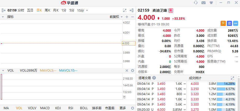 麦迪卫康今日正式上市,首挂高开33.33%,报4港元,成交额9265万港元。