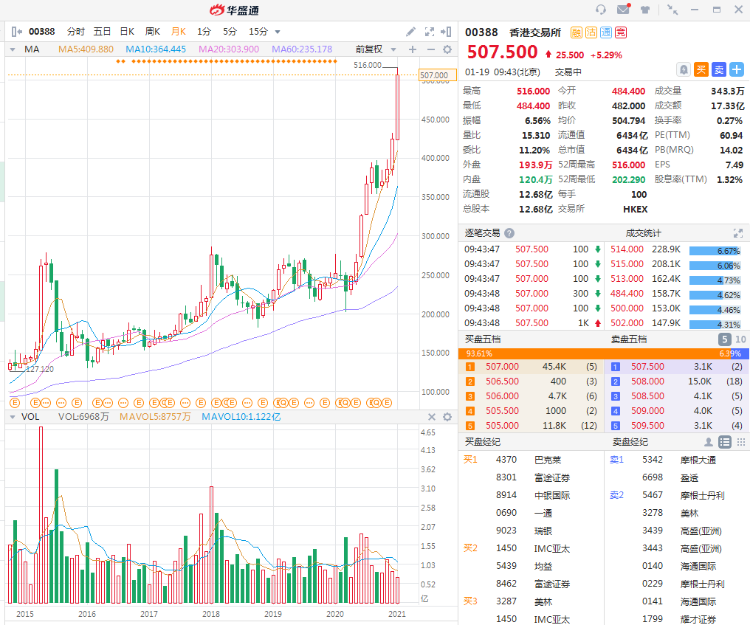 1月19日消息,香港交易所涨5.29%,现报507港元,股价创历史新高。市场消息指,快手拟发行4.159亿股,招股价上限约93港元。