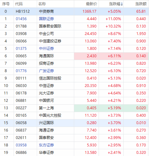 港股中资券商股全线上涨,截至发稿,国联证券涨11%,国泰君安国际涨超10%,中金公司涨超8%,中信建投证券涨超7%,招商证券、海通证券、广发证券等跟涨。
