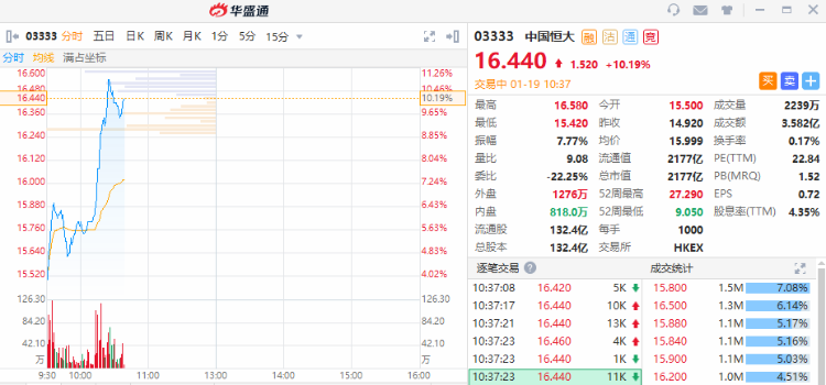 1月19日消息,中国恒大盘中涨幅扩大,截至发稿,涨10.19%,报16.44港元,最新市值2177亿港元,成交额3.582亿港元。