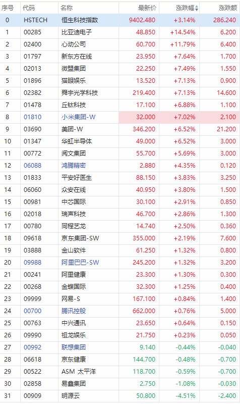 1月19日消息,恒生科技指数持续走高,大涨超3%。成分股中,美团盘中一度涨超7%,高见348港元,刷新历史新高,总市值一度突破2万亿港元。此外,小米集团涨超7%,报32港元,总市值重新站上8000亿港元。