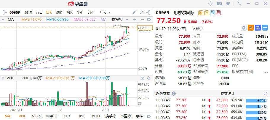 华盛资讯1月19日讯,思摩尔国际(06969)盘中大涨,股价再创历史新高。截至发稿,思摩尔涨7.82%,现报77.25港元,成交量达1348万股,成交额10.24亿港元,当前总市值为4530亿港元。