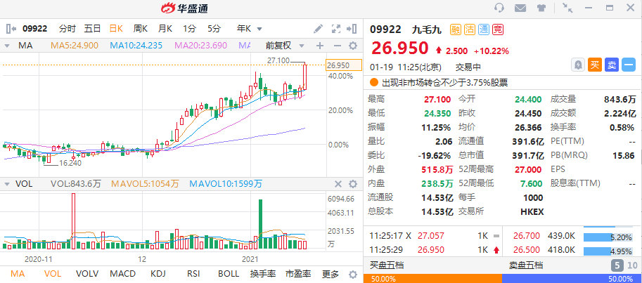 华盛资讯1月19日消息,两只餐饮股今日大涨,九毛九盘中一度涨超10%,股价创新高,市值逼近400亿,截至发稿,九毛九涨10.22%,报26.95港元。海底捞也同样大涨7%,突破所有均线,报65.6港元。