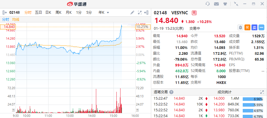 华盛资讯1月19日消息,小家电次新股VESYNC(02148)尾盘快速拉升,盘中涨幅超10%,突破历史高点。截至发稿,VESYNC涨10.25%,报14.848港元,成交额2.155亿港元,当前总市值达172.8亿港元。上市一个月,较发行价5.52港元累计涨近170%。