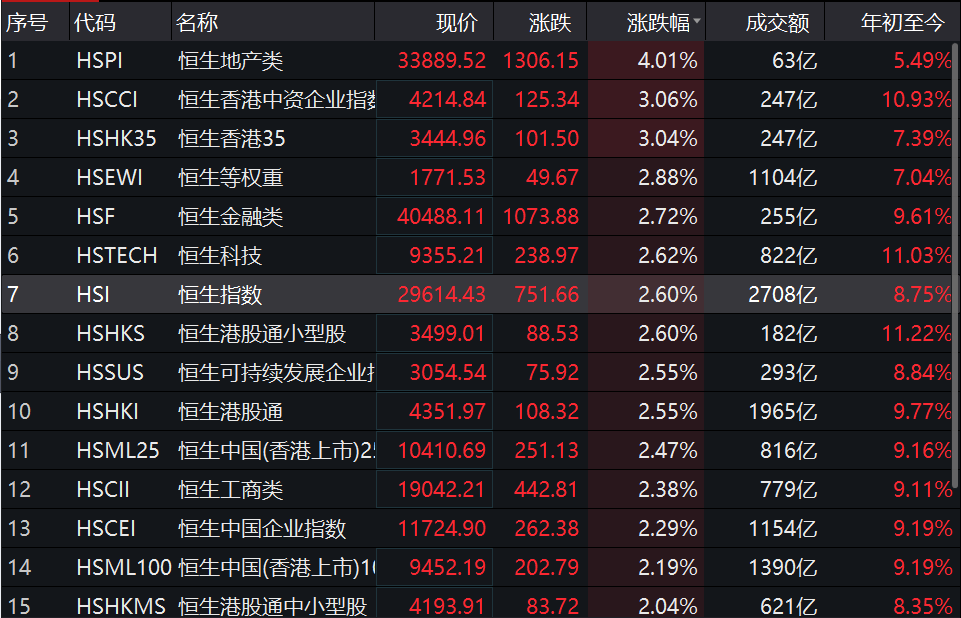 而在1月19日观察港股各大类型的成分指数,呈现江山一片大红的景象,恒生地产类指数涨超4%,恒生中资企业指数、恒生香港35指数涨超3%,其他指数普遍涨幅超过2%。