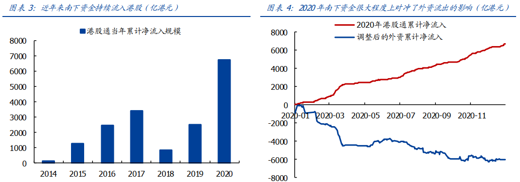 根据统计,2020年全年外资净流出港股规模近1.9万亿港元。而即使是在外围环境一片黯淡之下,港股通渠道仍然持续净流入港股,2020年全年港股通南下净流入规模达到7000亿港元之多。