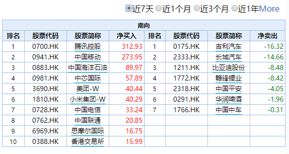 其中互联网巨头腾讯控股近七天获得净买入312.93亿港元排名第一,中国移动获净买入273.95亿港元排名第二,中国海洋石油获净买入89.97亿港元排名第三。