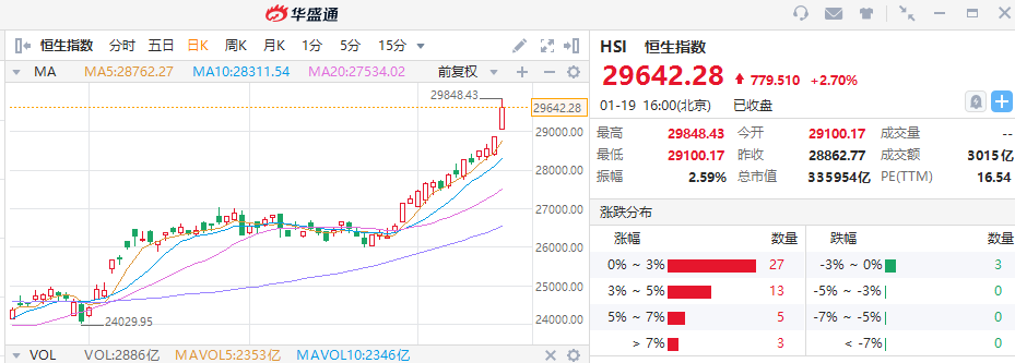近期的港股市场一扫2020年跑输全球市场的弱势表现,恒生指数在2020年12月23日创下25998点的低位后,截至2020年1月19日收市,总计不到一个月累计涨幅已超13%。