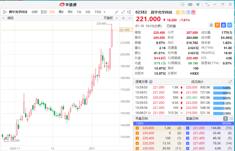 今日,舜宇光学大涨近8%,股价刷新历史新高。自去年以来,舜宇光学的股价就一路上涨,2020年初至今涨幅已超过60%,市值超过2400亿港元,去年3月至今股价已实现翻倍。市场传闻,舜宇光学近日大涨是由于其手机镜头业务将进入苹果供应链。