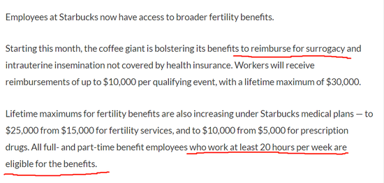 *从本月开始,这家咖啡巨头将加强其福利,以补偿健康保险未涵盖的代孕和宫内授精......所有每周工作至少20个小时的全职和兼职福利雇员都有资格领取这些福利。
