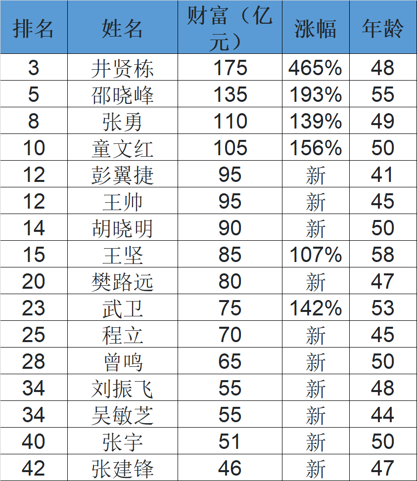 阿里系共16人位列榜单,蚂蚁集团董事长48岁的井贤栋和阿里巴巴董事长48岁的张勇分别以175亿元和110亿元财富位列第三名和第八名。