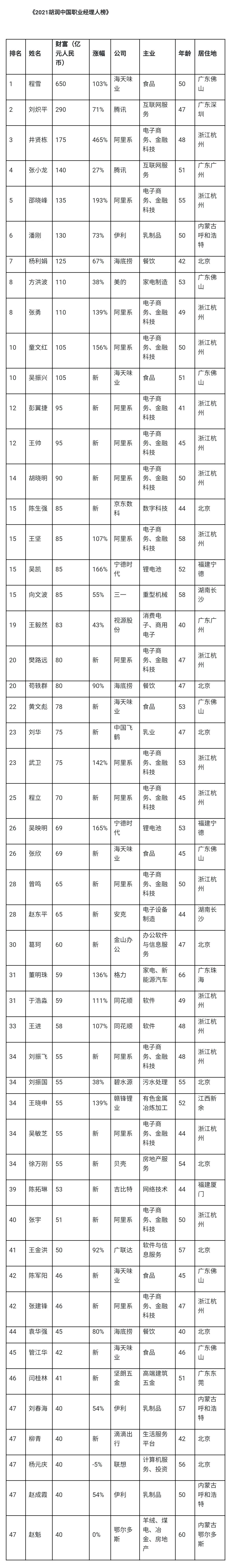 榜单显示,海天味业50岁的程雪以650亿元财富成为“中国职业经理人首富”,也就是中国现在身家最高的打工人了。