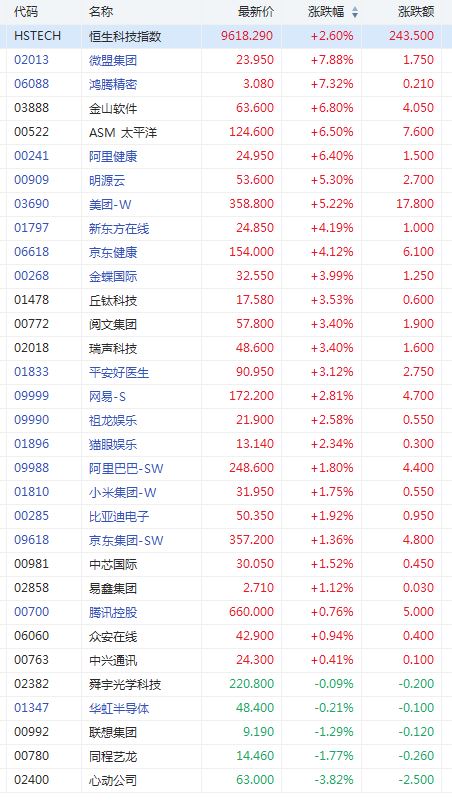 截至发稿,微盟集团涨超7%,盘中创新高。ASM太平洋、阿里健康涨超6%,新东方在线、京东健康涨超4%,网易涨超2%,阿里、京东涨超1%。
