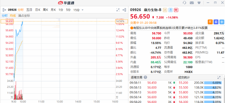 康方生物-B(09926)与中生制药(01177)共研产品发布最新研究结果。康方生物早盘高开高走,截至发稿,涨14.56%,报56.65港元,成交额1.624亿港元。