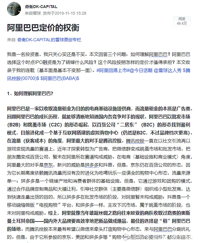 用了两周时间,分别在美股和港股,我买了阿里巴巴,因为我在2019年11月15日的《阿里巴巴定价的权衡》里写过,“阿里巴巴在‘电商基础设施+流量广告租金’的赛道上衡量,应当相对腾讯有溢价,因此,如果阿里巴巴总市值低于腾讯,那么我就会做它们价差回归的押注”。我只是践行自己的投资策略而已。至于为什么不直接买腾讯控股,这个问题不应该问我,应该问你自己。
