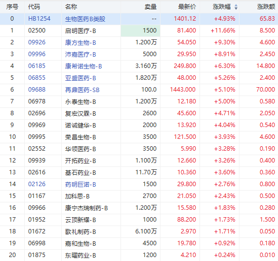 荣昌生物、开拓药业等涨超3%,药明巨诺、加科思等涨超2%。